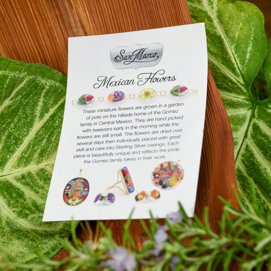 They are hand picked with tweezers early in the morning while the flowers are still small. The flowers are dried over several days then individually placed with great skill and care into Sterling Silver casings. Each piece is beautifully unique and reflects the pride the Gomez family takes in their work.